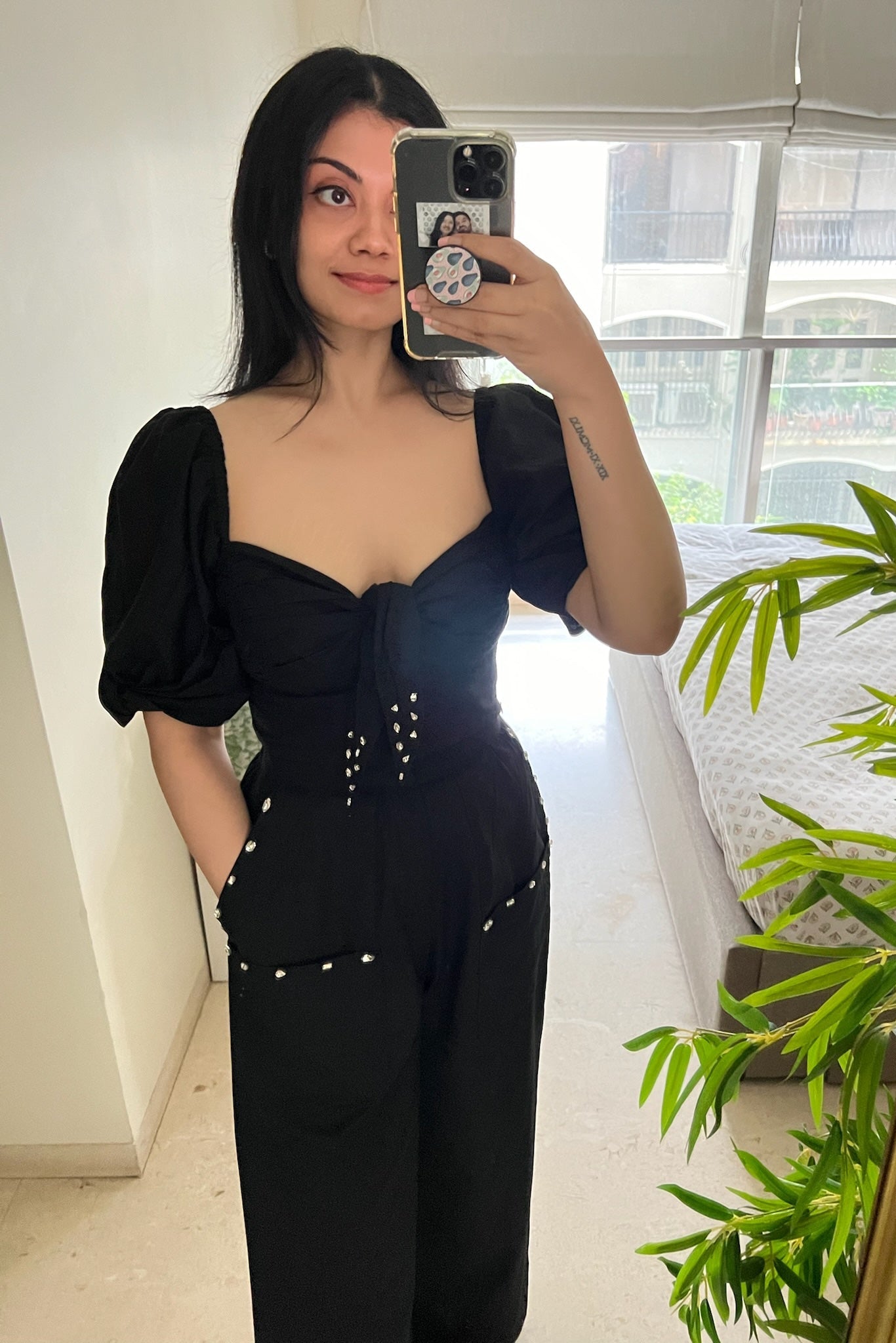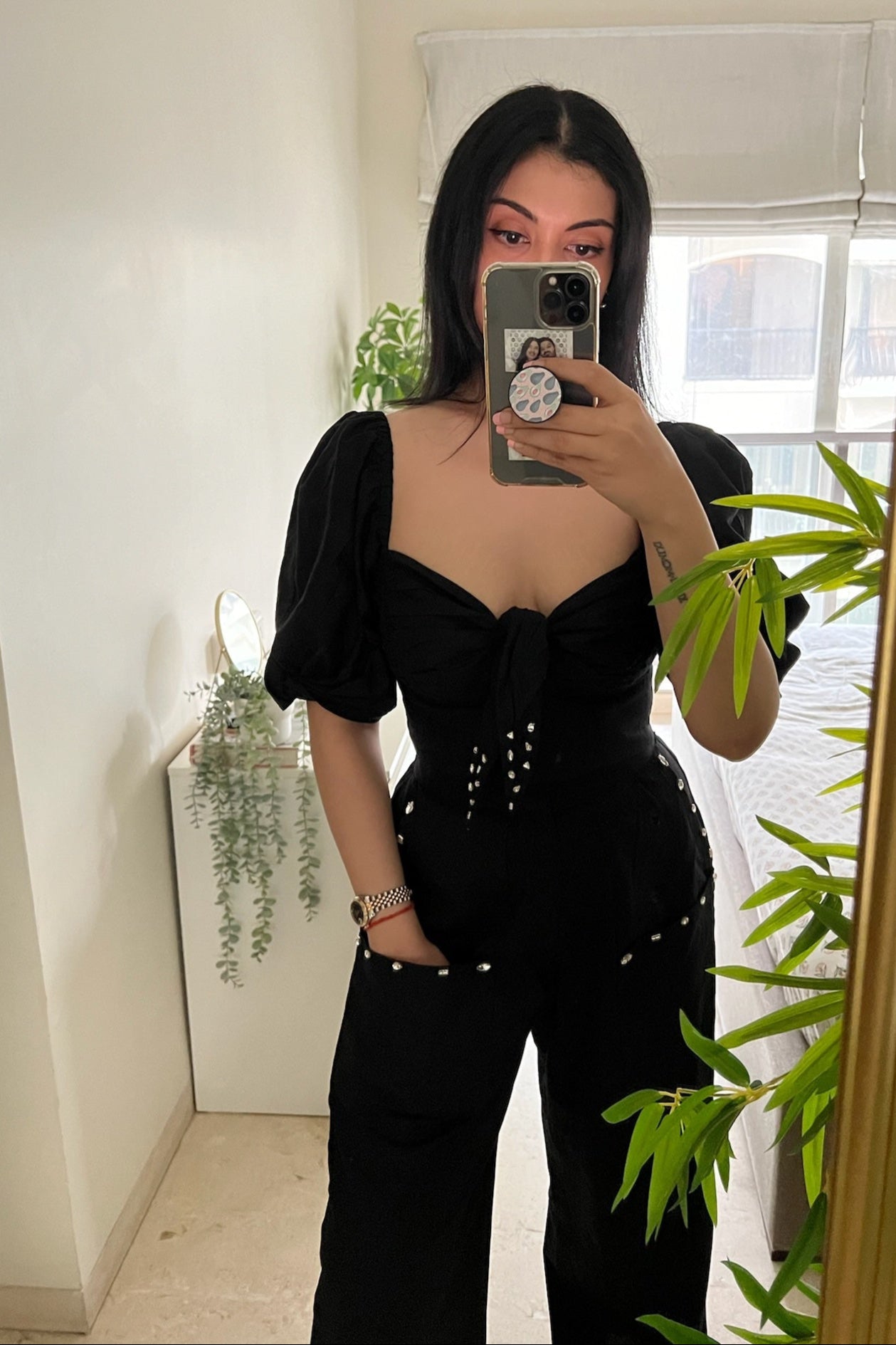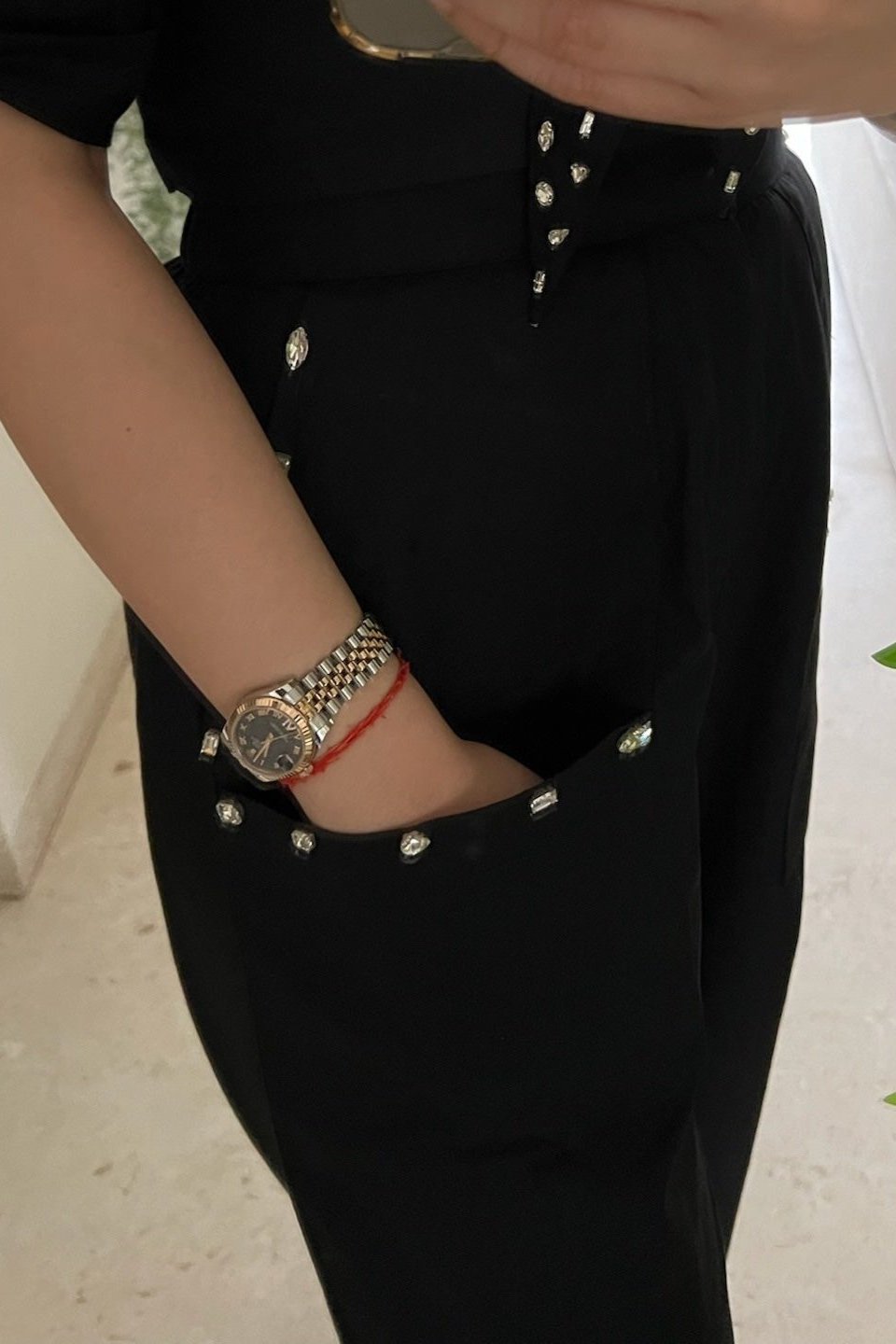 • Features four large front pockets lined with rhinestones for a subtle but standout look