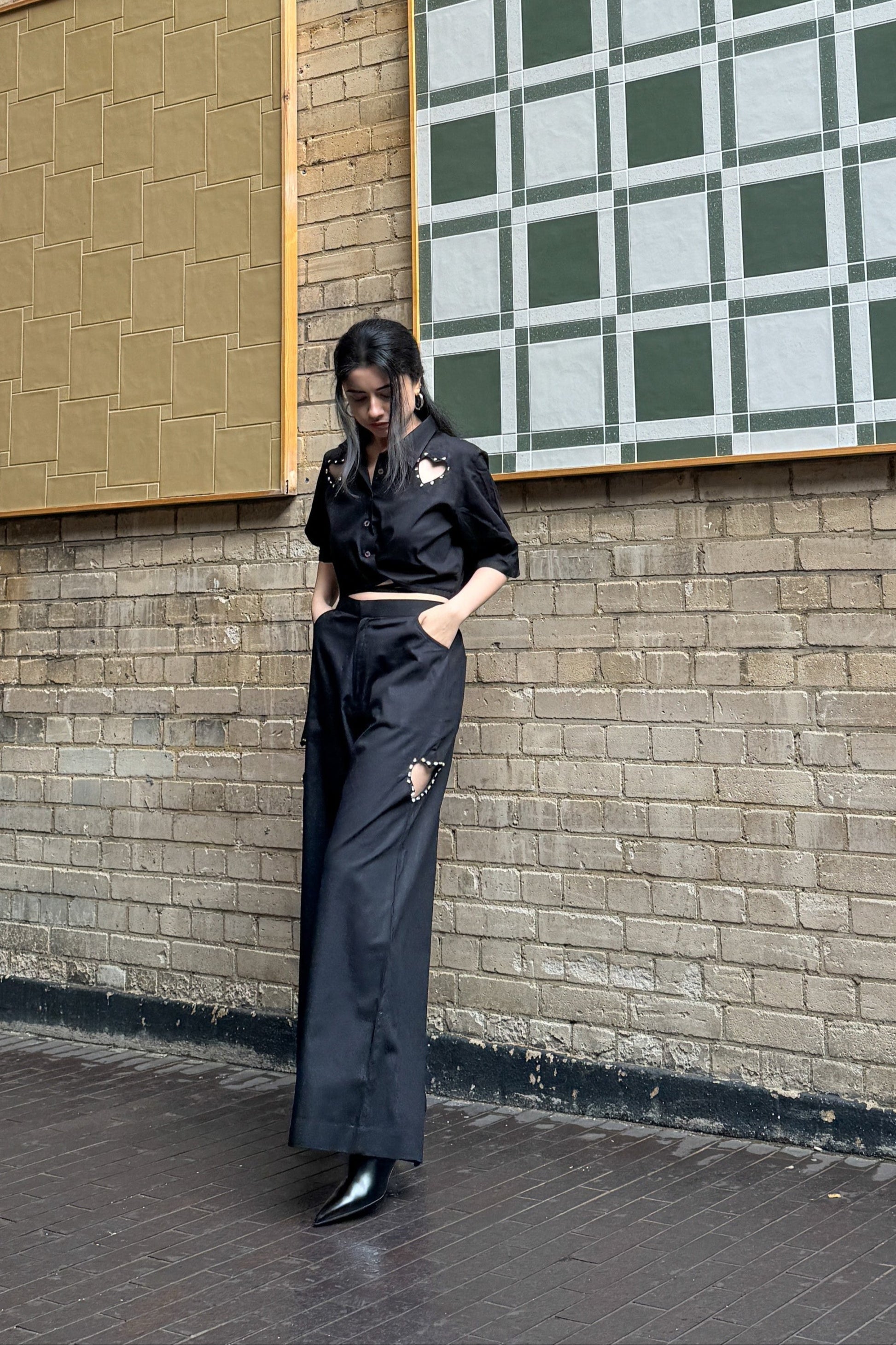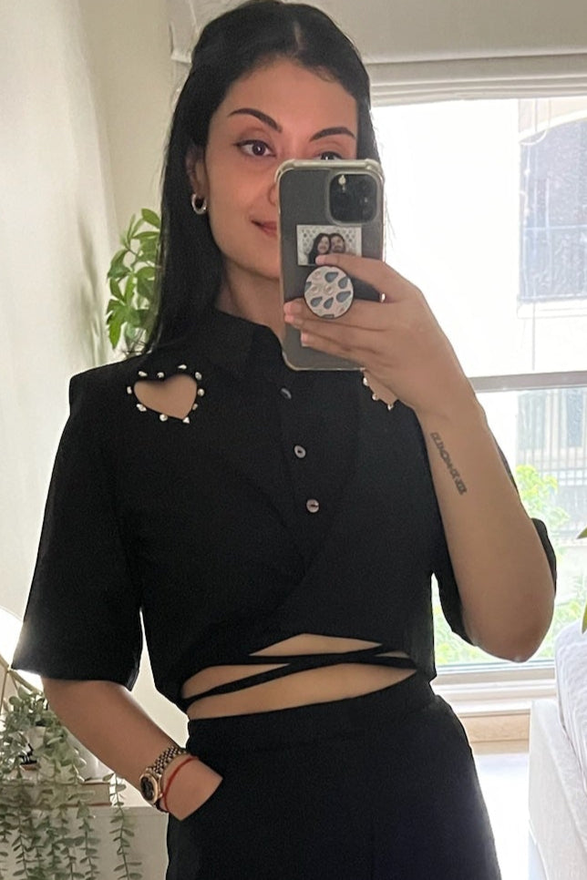 Turn heads at your next afterparty with our stunning Afterparty Set, featuring the flirty Heart Tie Up Shirt paired with chic Heart Cutout Trousers.