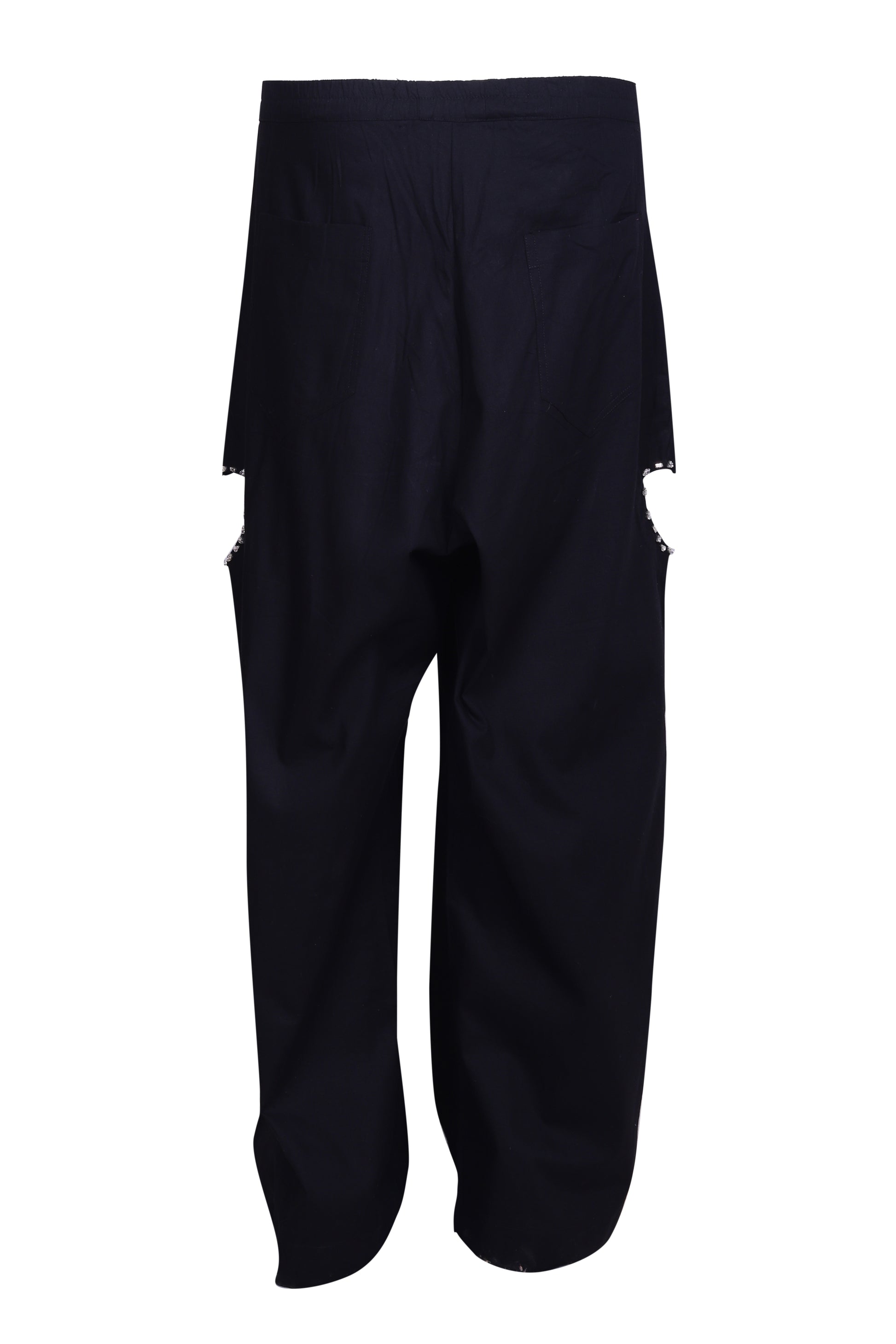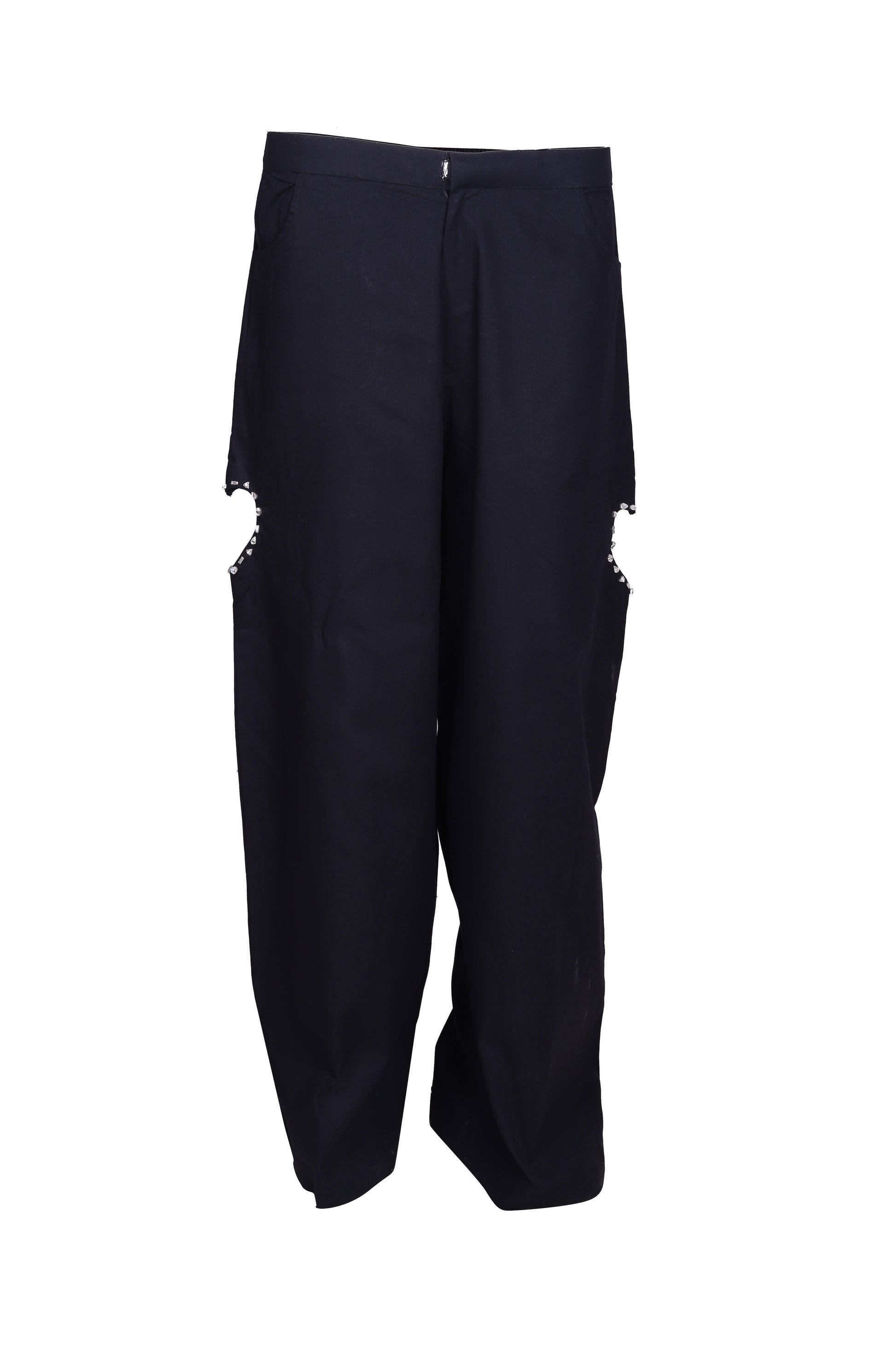 • Designed for bold style, these black high-waist trousers feature eye-catching heart-shaped cutouts on the thighs, framed with sparkling rhinestone borders.