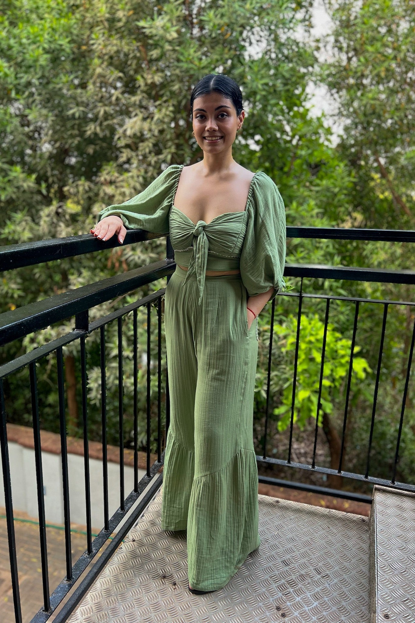 Crop top with flowy sleeves, front tie, and smocked back. High waisted trousers with a boho vibe. Elastic waist and two pockets!