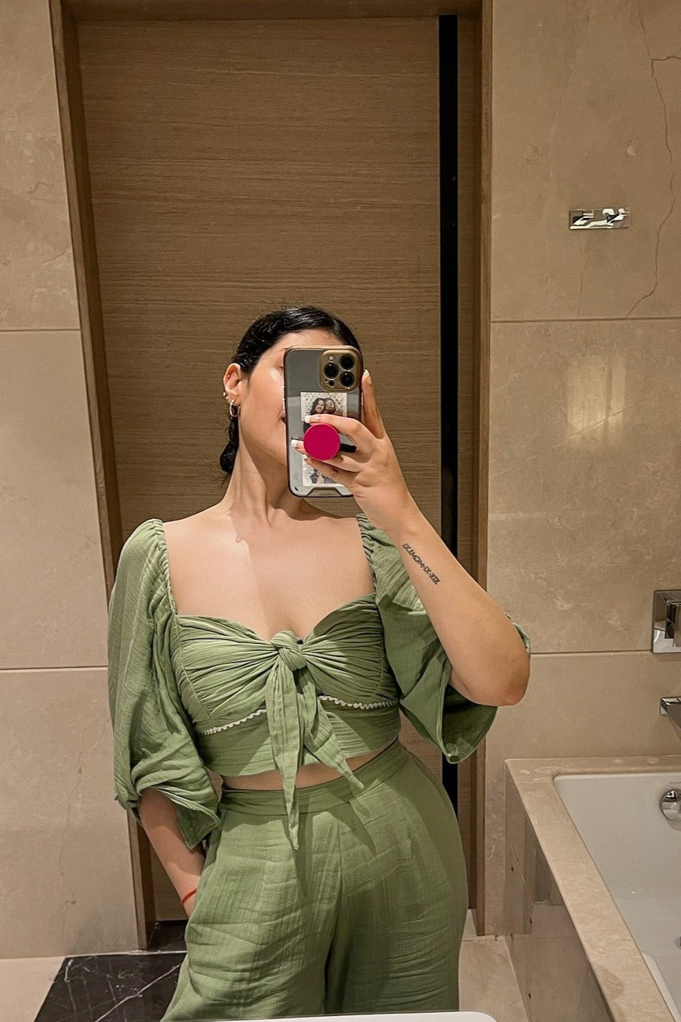 Crop top with flowy sleeves, front tie, and smocked back. Partially lined