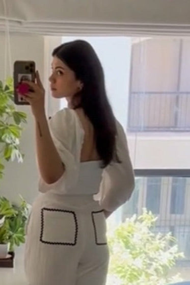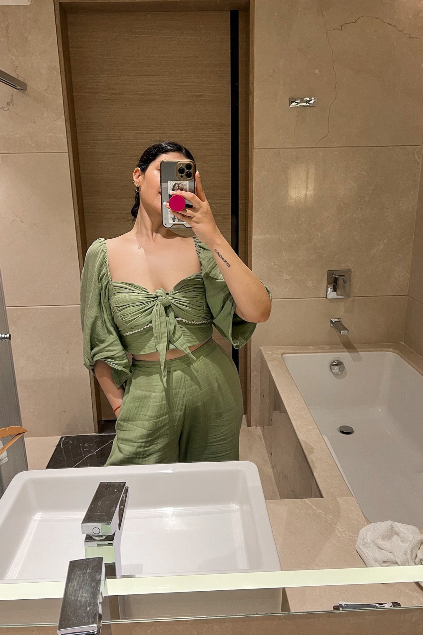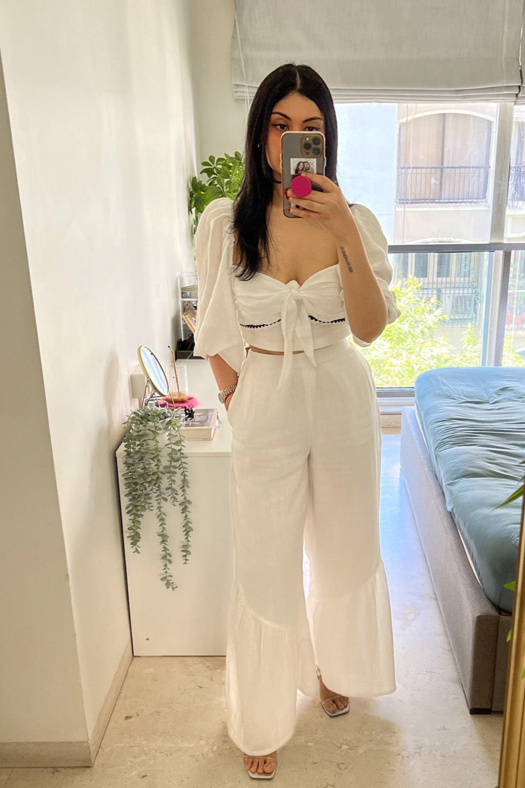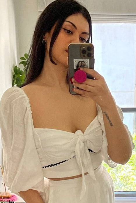 Crop top with flowy sleeves, front tie, and smocked back. Partially lined
