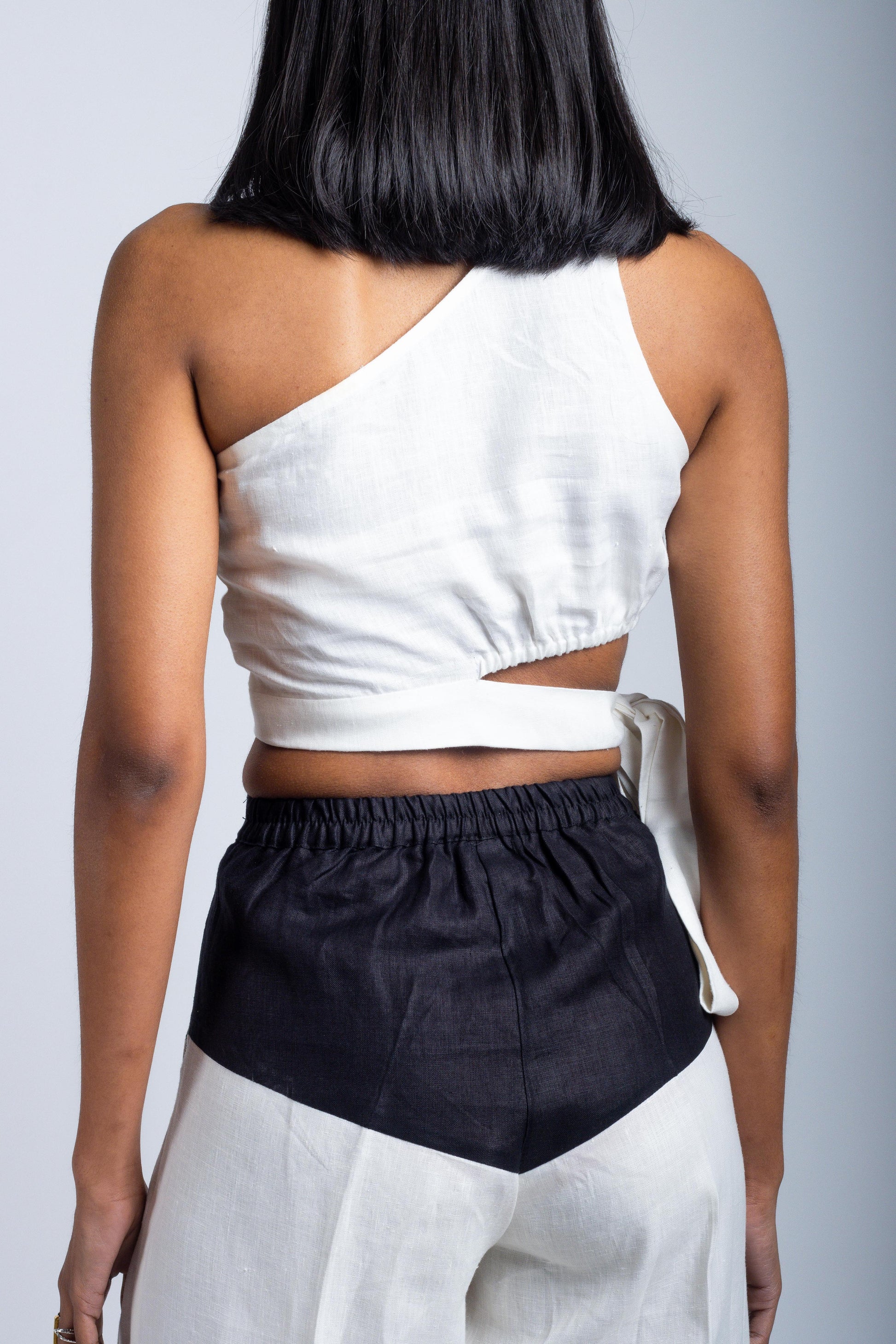 Off shoulder top with a side tie that creates a fun waist cut out!