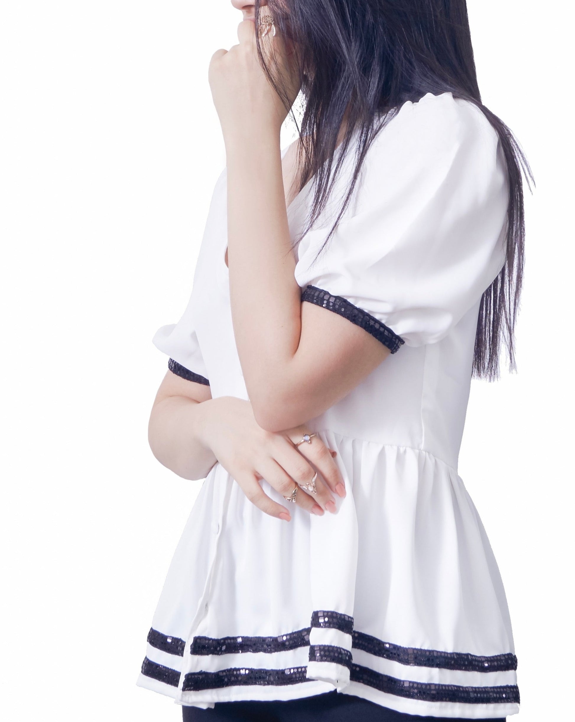 half sleeve top with 5 buttons, elastic sleeve, sequin stripe detail, crease resistant