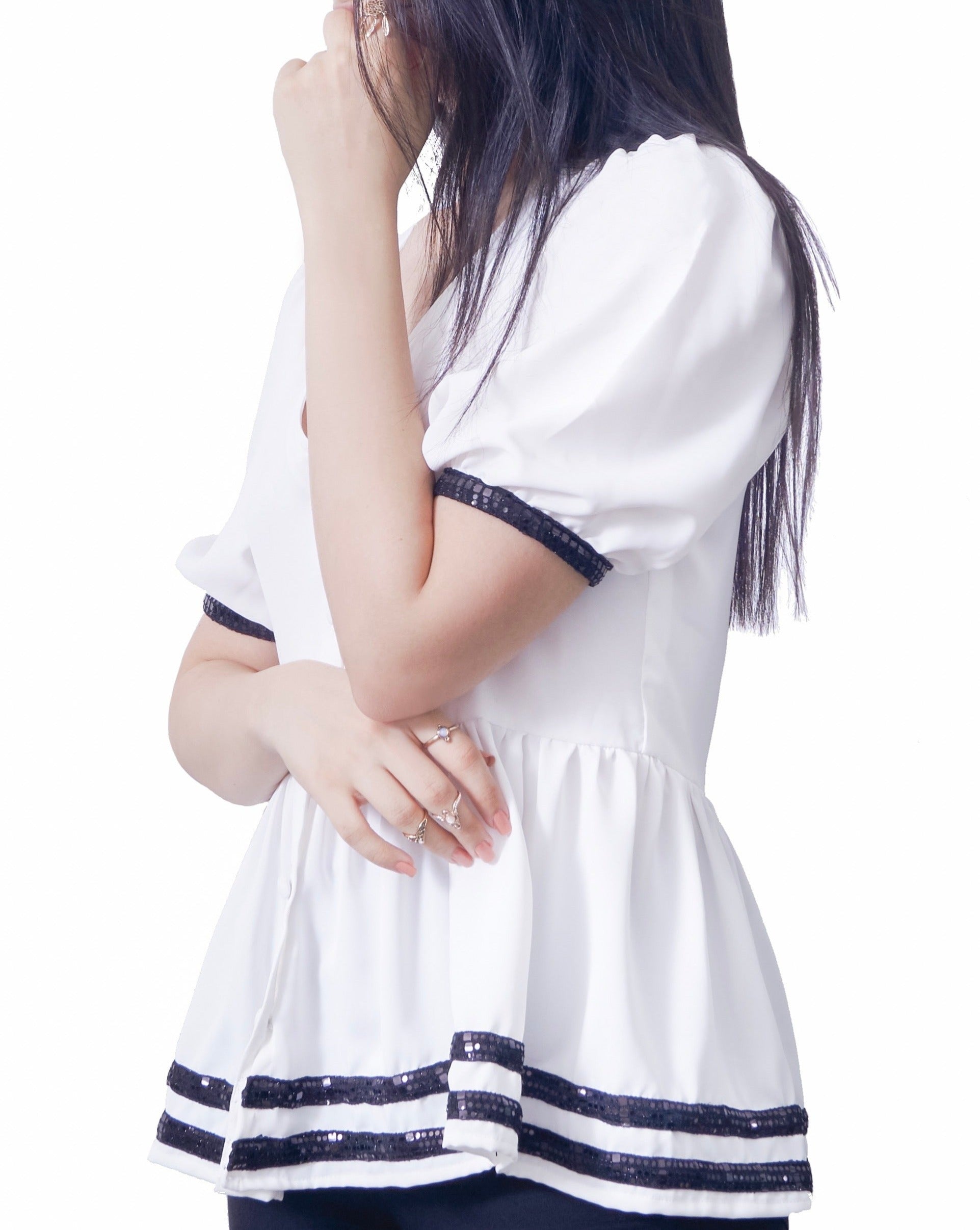 half sleeve top with 5 buttons, elastic sleeve, sequin stripe detail, crease resistant