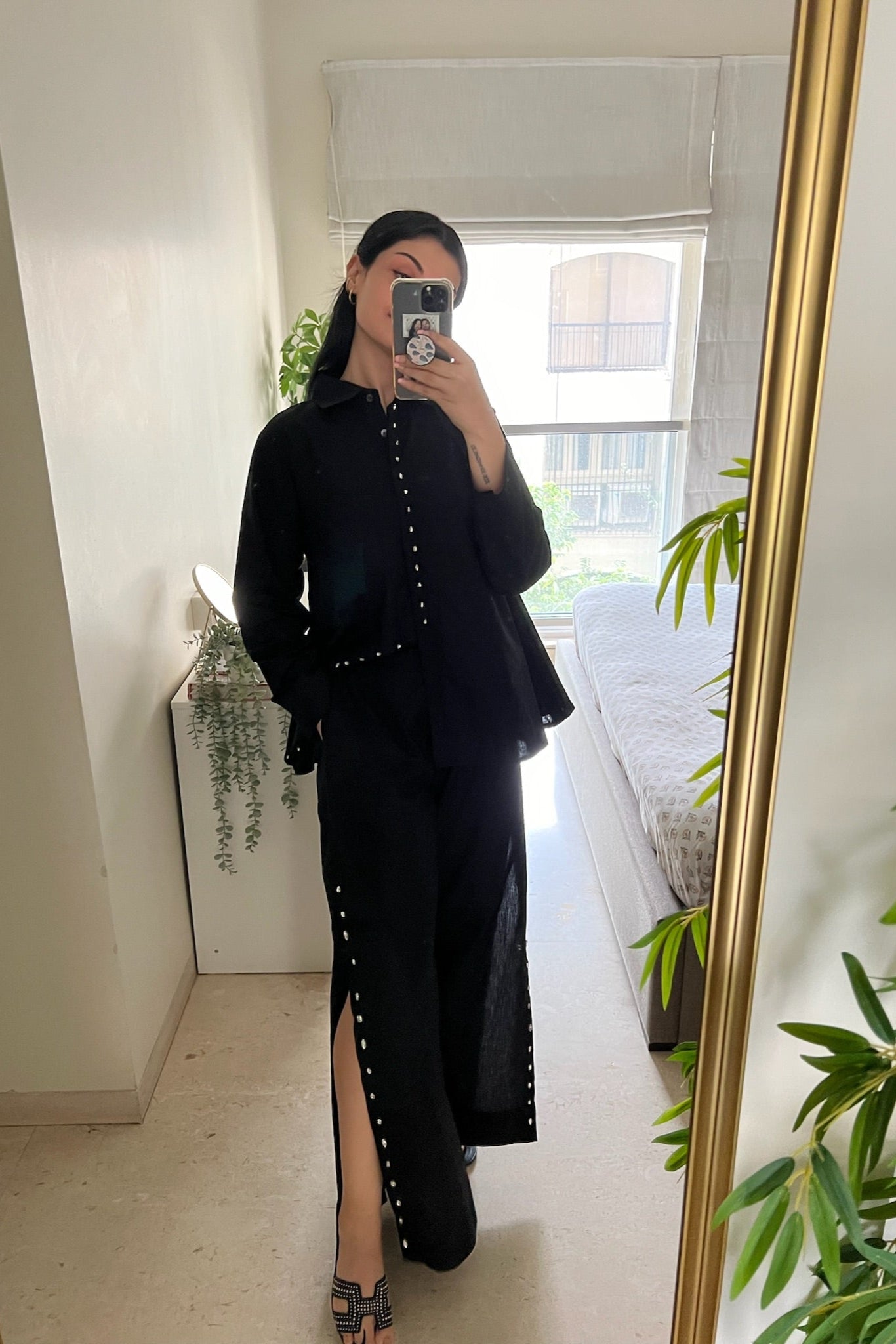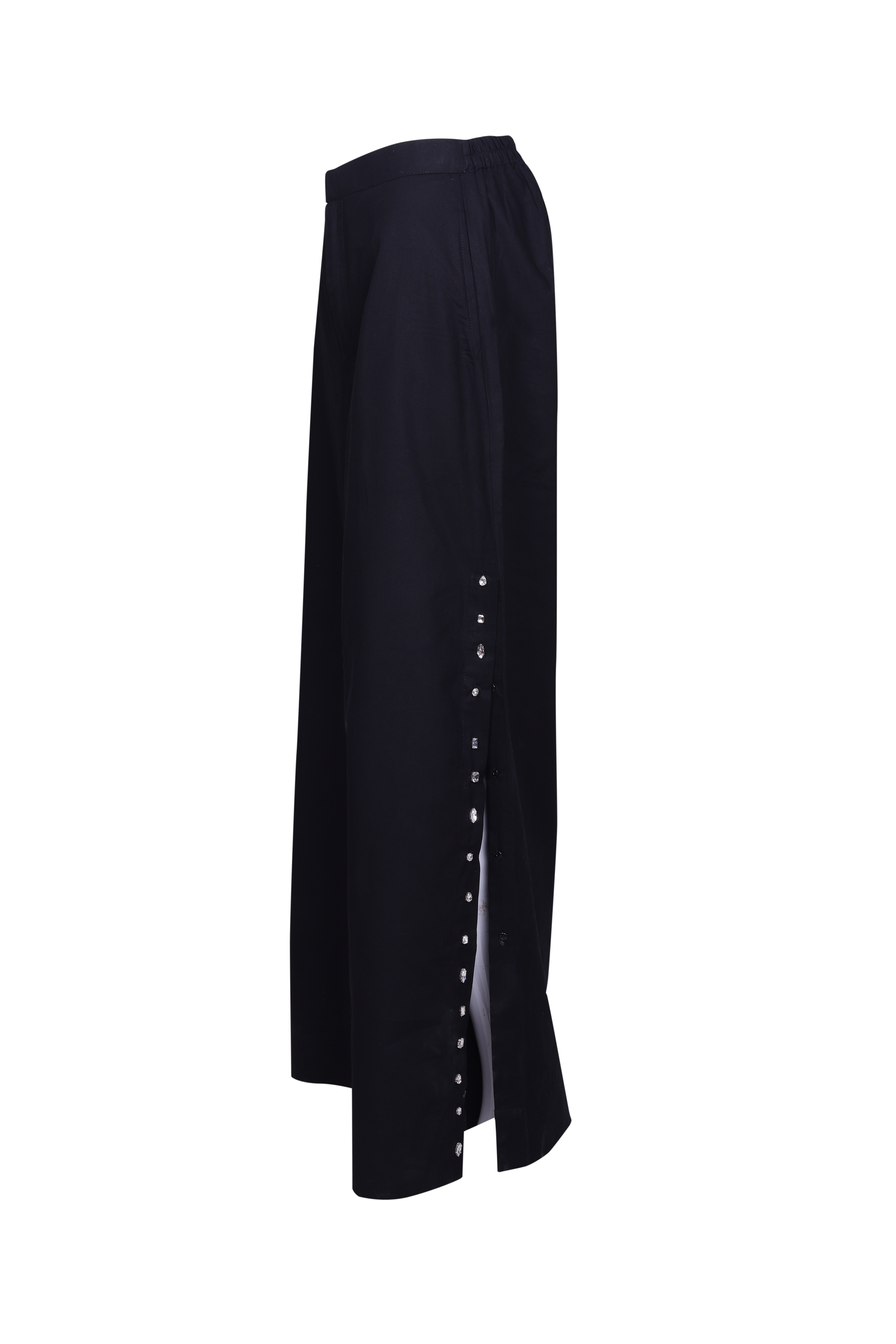 • Crafted for bold style, these black high-waist trousers feature a striking adjustable slit adorned with large rhinestones for added glamour.