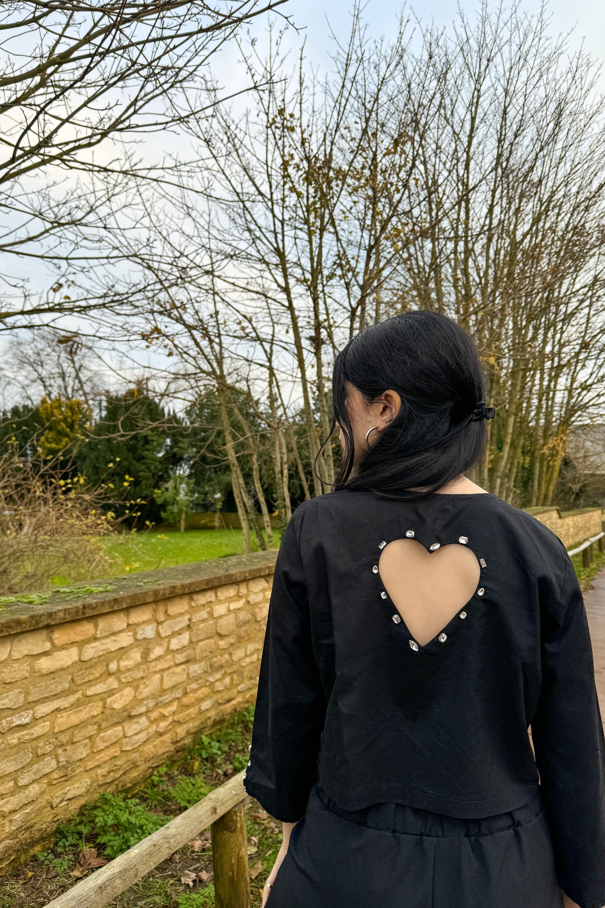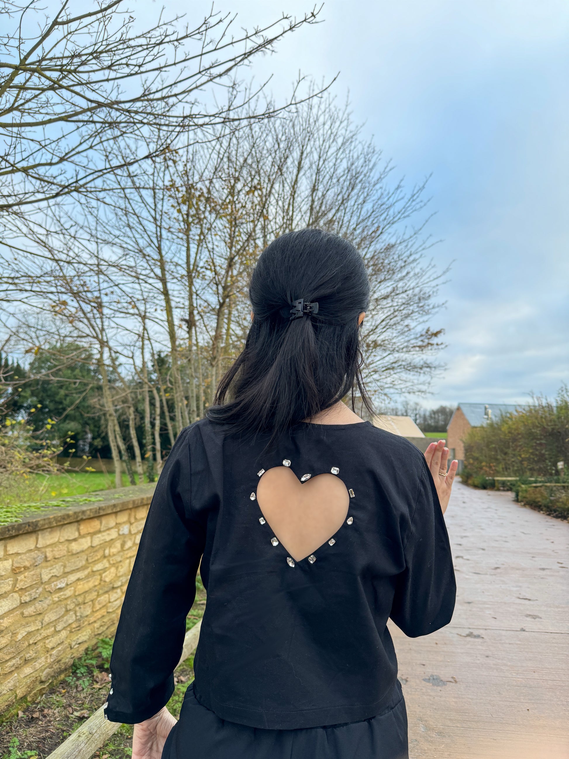 • Crafted from soft cotton, this regular-fit shirt features a stunning heart-shaped cutout on the back, lined with rhinestones, and positioned high enough to cover your bra strap for comfort.