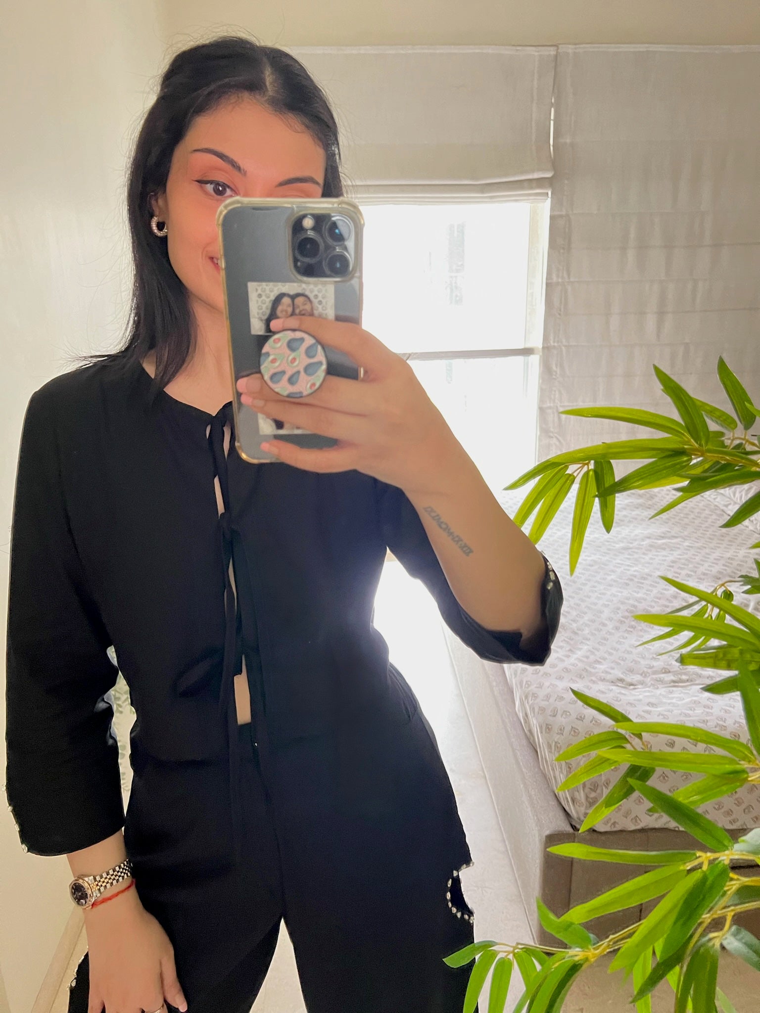 • A front tie-up design adds a playful edge, while the crop length makes it ideal for pairing with high-waisted bottoms.