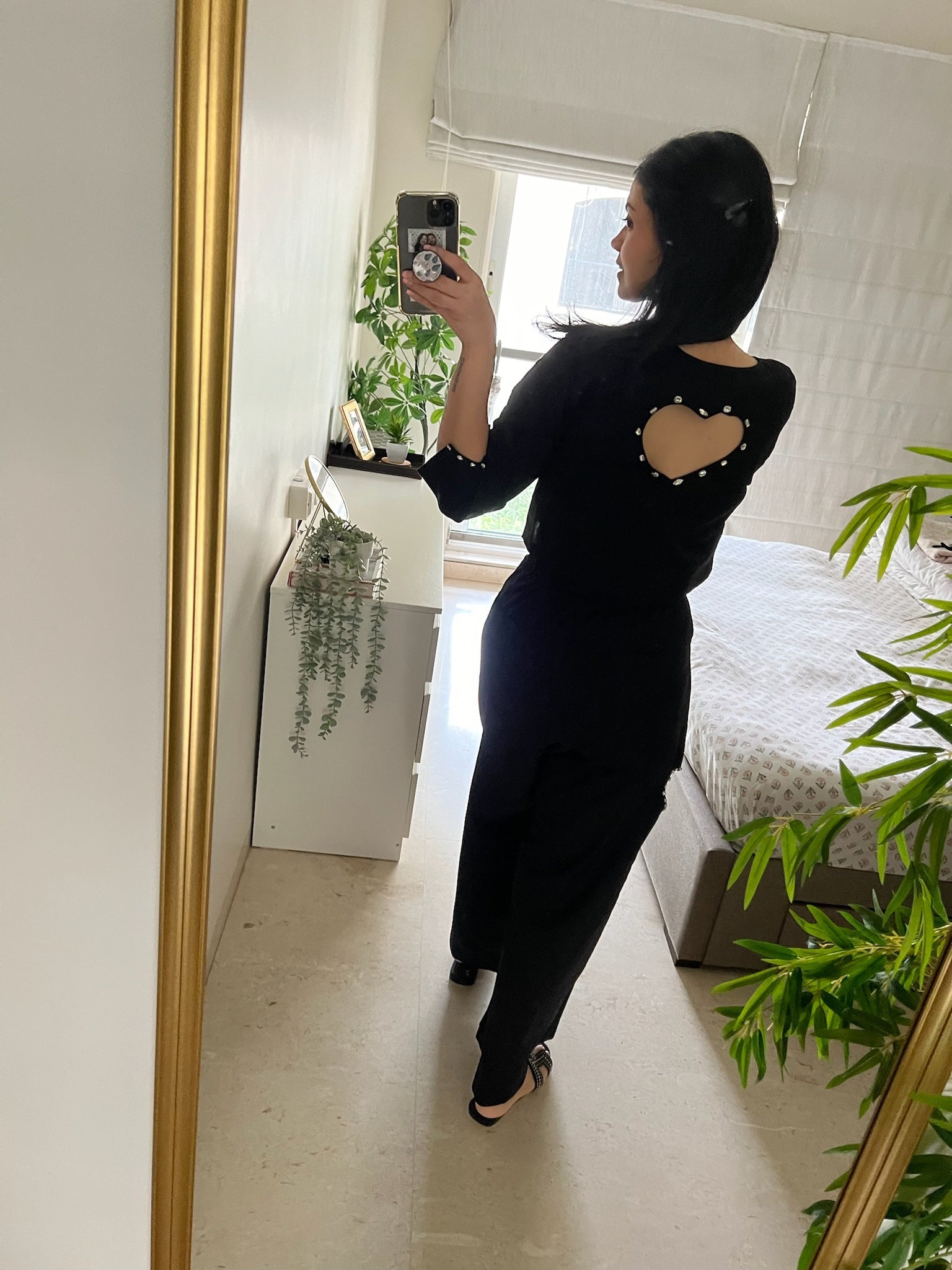 Turn heads at your next weekend getaway with the flirty Heart Back Shirt paired with chic Heart Cutout Trousers.