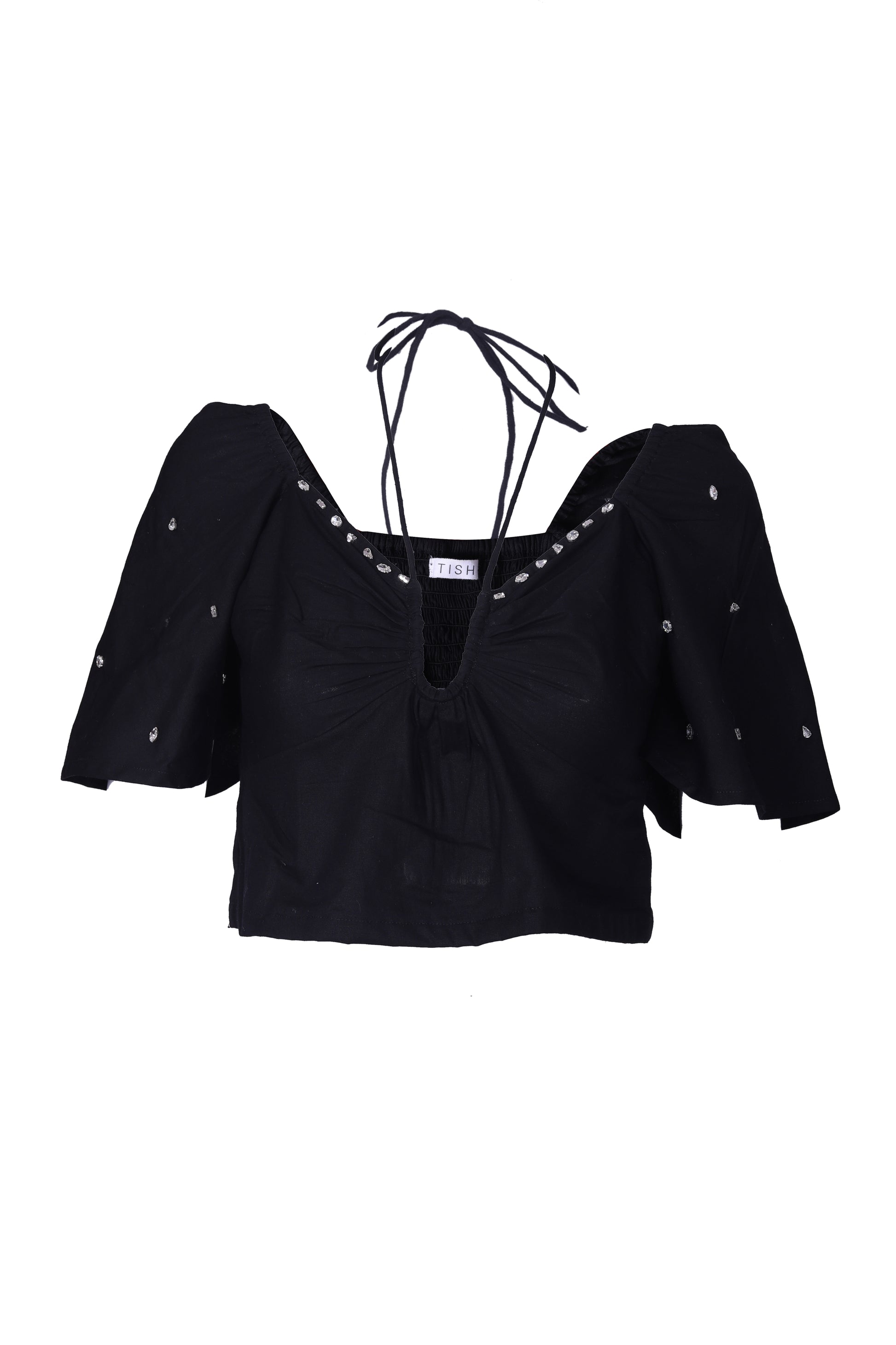 Elevate your bar night look with our stunning black halter top, designed for a stylish statement.