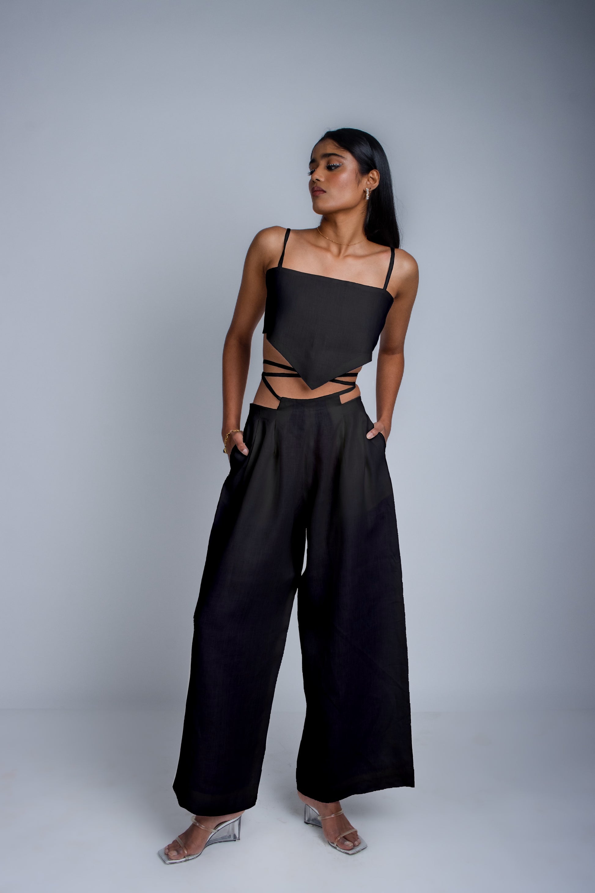Back tie triangle-shaped handkerchief top with adjustable shoulder straps.